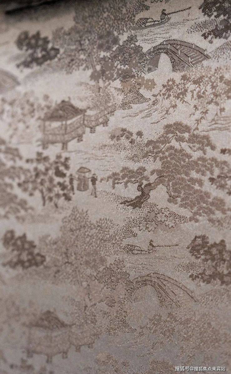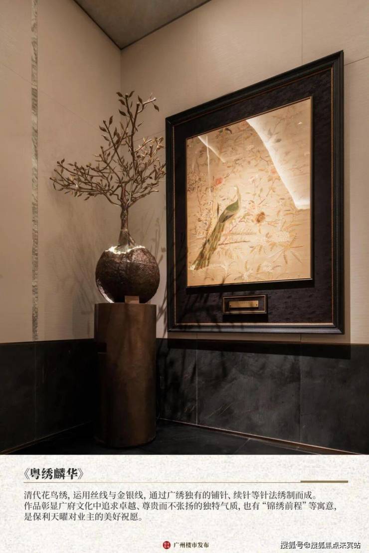 在射灯照耀下,广绣独有的针法丝理巧妙的物象肌理不仅熠熠生辉,也带给业主“锦绣前程”、“富贵绵延”等美好祝愿。