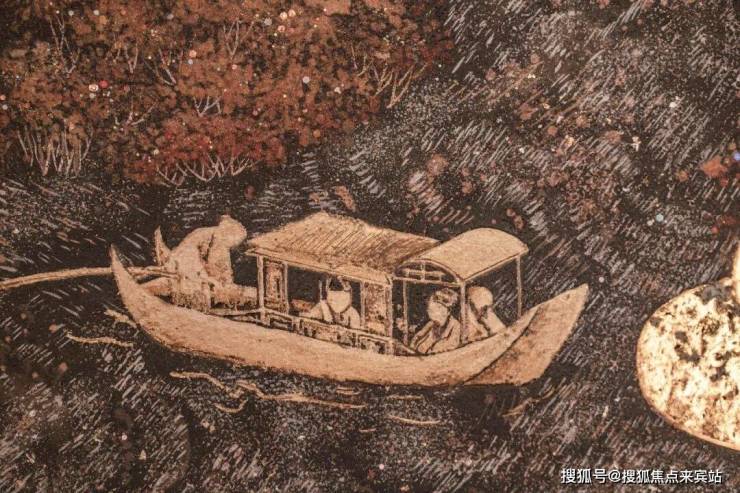 下面这幅作品名为《金缕》,既有贝壳的微妙光泽与色彩变幻,又与底漆色彩、质感完美融合,营造出丰富的视觉层次和温暖含蓄的东方意境,成就了作品独特的艺术魅力与持久生命力。