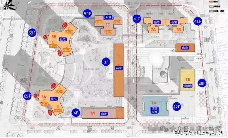 占地4.2万㎡,容积率6.63,分为两期不同地块。一期为1栋A座为150米高公寓+酒店、1栋B座为92米高保障房、2栋A/B座位为138米回迁住宅。