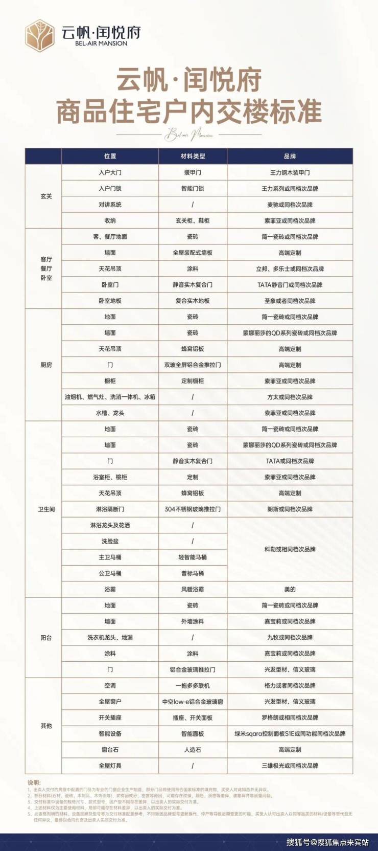 云帆·闰悦府精装用材上采用行业内一线品牌按照改善型住宅的标准来打造,入户门采用王力钢木装甲门,配备智能门锁系统,室内全屋墙面采用高端定制装配式墙板,地面客餐厅为简一品牌瓷砖,全屋配以TATA静音实木复合门,厨房方面,厨房四件套(油烟机、燃气灶、洗碗机、冰箱)配置方太品牌,全套厨房系统直接可用,省心省力,卫生间配置尤为考究,标配科勒品牌花洒与五金配件,全屋科勒配备马桶,主卫配备轻智能马桶,公卫为普标陶瓷马桶,且全屋搭配格力中央空调多联机系统,整体风格现代高端。