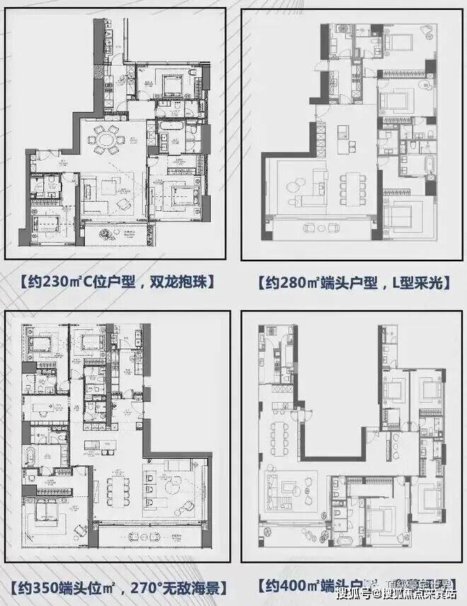 面积:户型多样,包括230-280㎡3房3卫、300-380㎡4+1房5卫、576㎡4+1房6卫、600-700㎡6-7房7卫等