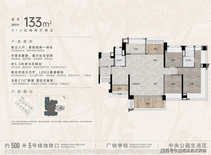 中央公园”,紧邻大脚印公园,距离地铁约500米,紧邻学校、酒店,户型涵盖75-88㎡三房,105、125、142㎡四房。