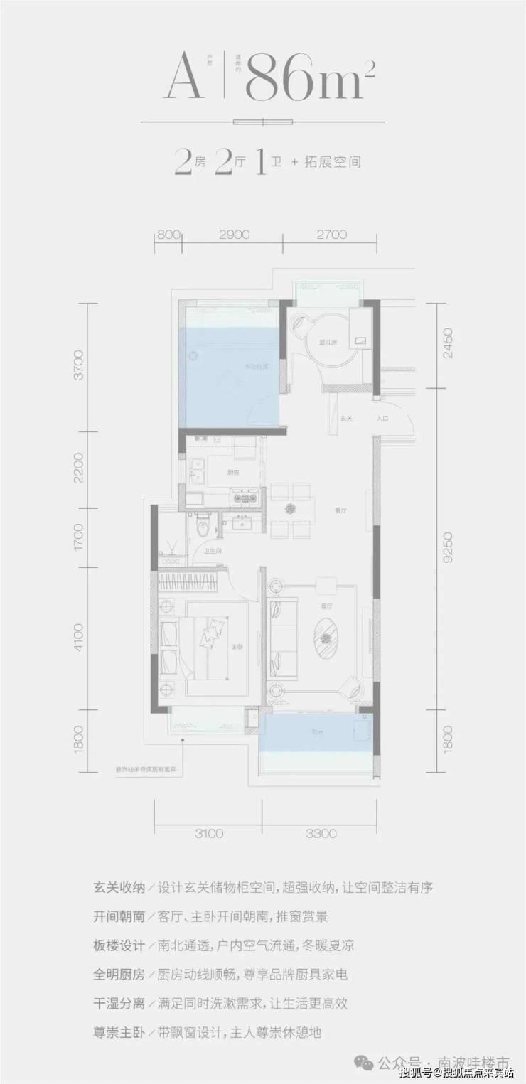 A 户型 —— 建面约 86㎡ 2 房 2 厅 1 卫 + 拓展空间。