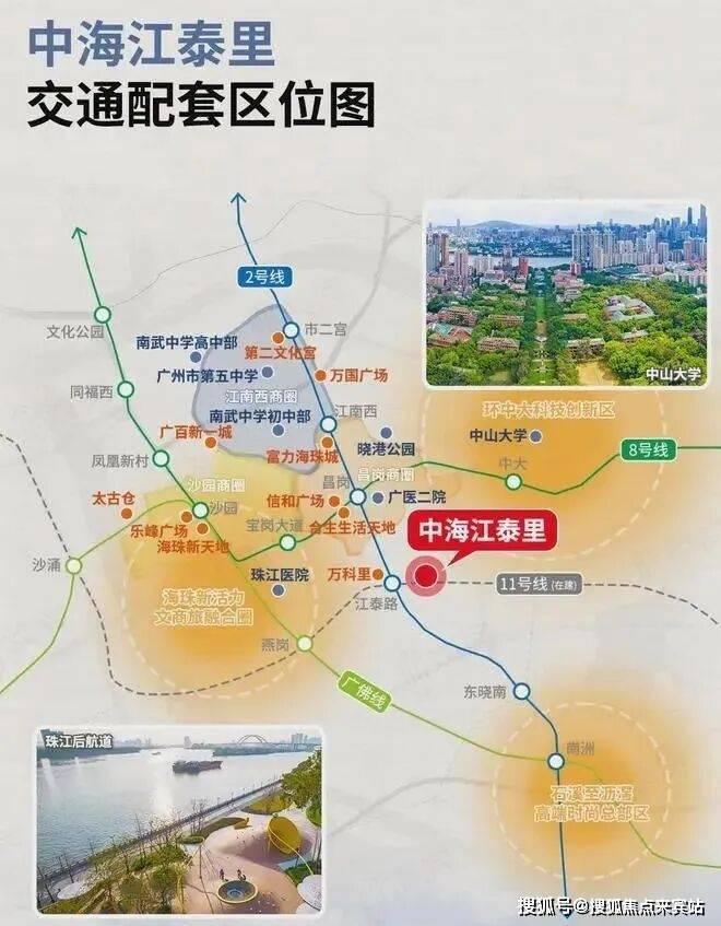 地铁交通:项目距离江泰路地铁站150米左右,双地铁上盖,2号线与在建11号线广州环线。经地铁出行可实现7站至南站、7站至琶洲,也可换乘3号线、1号线、8号线,能到达全区各个地方。