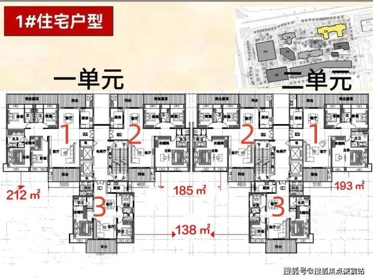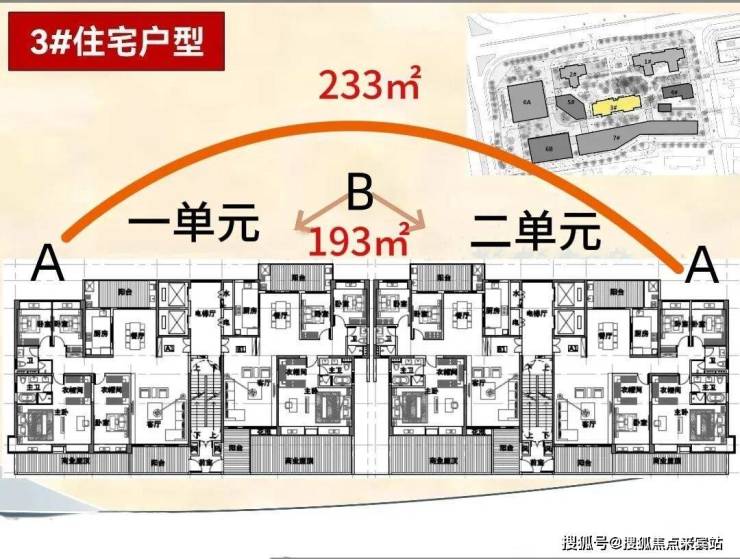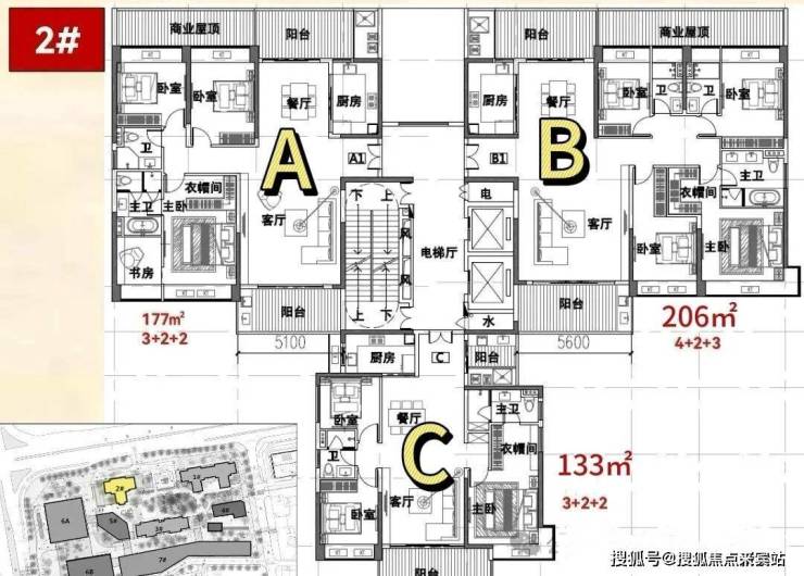 其中2栋住宅个子和体型都比较小,2梯3户共30层!A户型是177平米三房可还四房,B户型是206平米双套房设计四房,跟1栋1单元01户型结构相似,我认为这两条腿的户型和景观资源都是比较优质的,如果有这样的户型放盘你可以多关注一下!