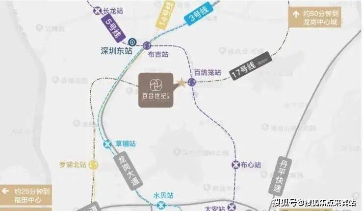 项目于5/17号线(建设中)百鸽笼站双地铁上盖,3/14号线环绕,1站瞬达罗湖,4站抵达福田芯。