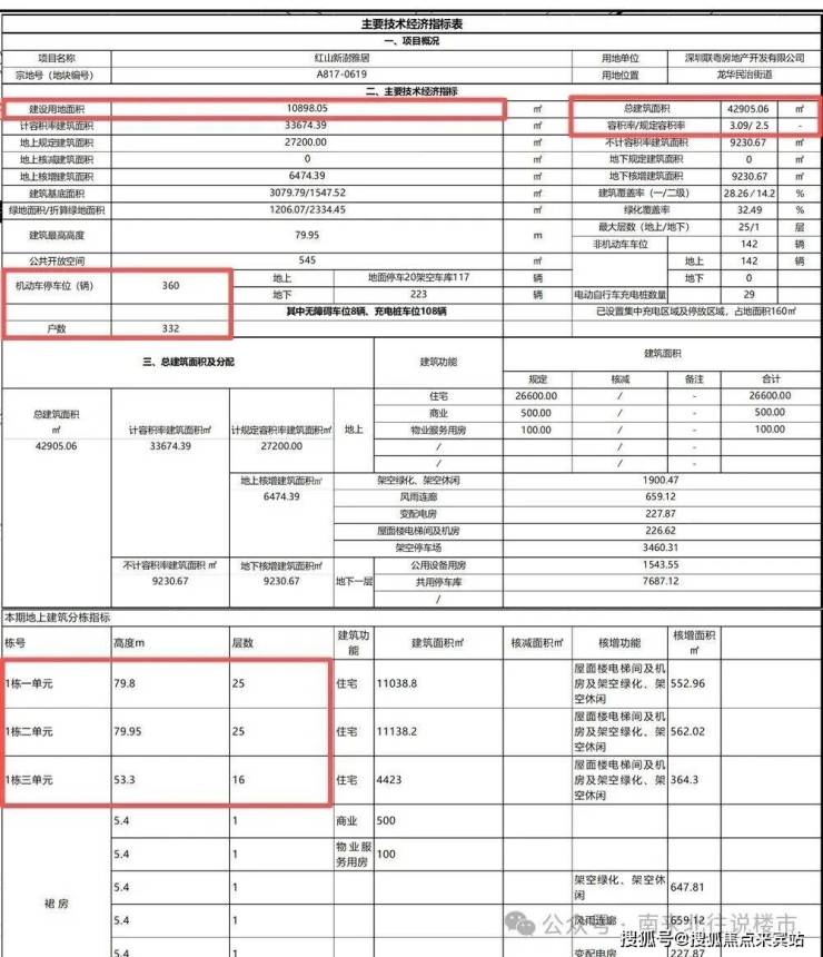 项目总规划户数332户,由3栋住宅组成,其中1栋一单元和二单元总高25层,2梯6户;三单元总高16层,2梯4户;车位360个!