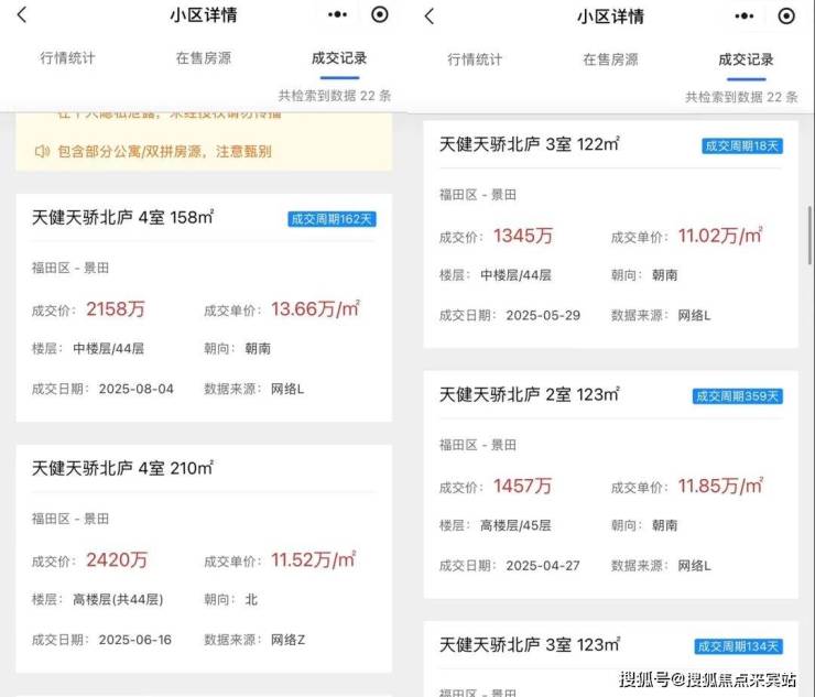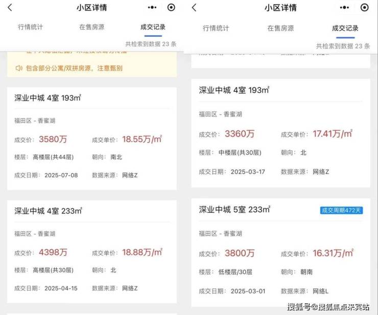 但天健天骄北庐就有点“拖后腿”,2019年8月29日,天健天骄南苑开盘,推出515套90-171㎡住宅,开盘当天售出414套,去化率80%。2020年11月28日,天健天骄北庐开盘,推出207套122-266㎡住宅,备案价11.76万,约4小时售罄。2022年6月,天健天骄西筑开盘,去化约9成。当时开盘价格约为11.4万元/平方米。2025年8月二手房最低价去到了11.52万/㎡,最高价13.66万,主要是同片区新盘竞争太激烈。加上片区随然说靠近香蜜湖但毕竟是属于景田片区,再就是学区没有香蜜湖优质,带的是荔园外国语小学(天骄校区)➕红岭教育集团科技中学。相比上面深业中城不管是地段还是学区都是有所差距的