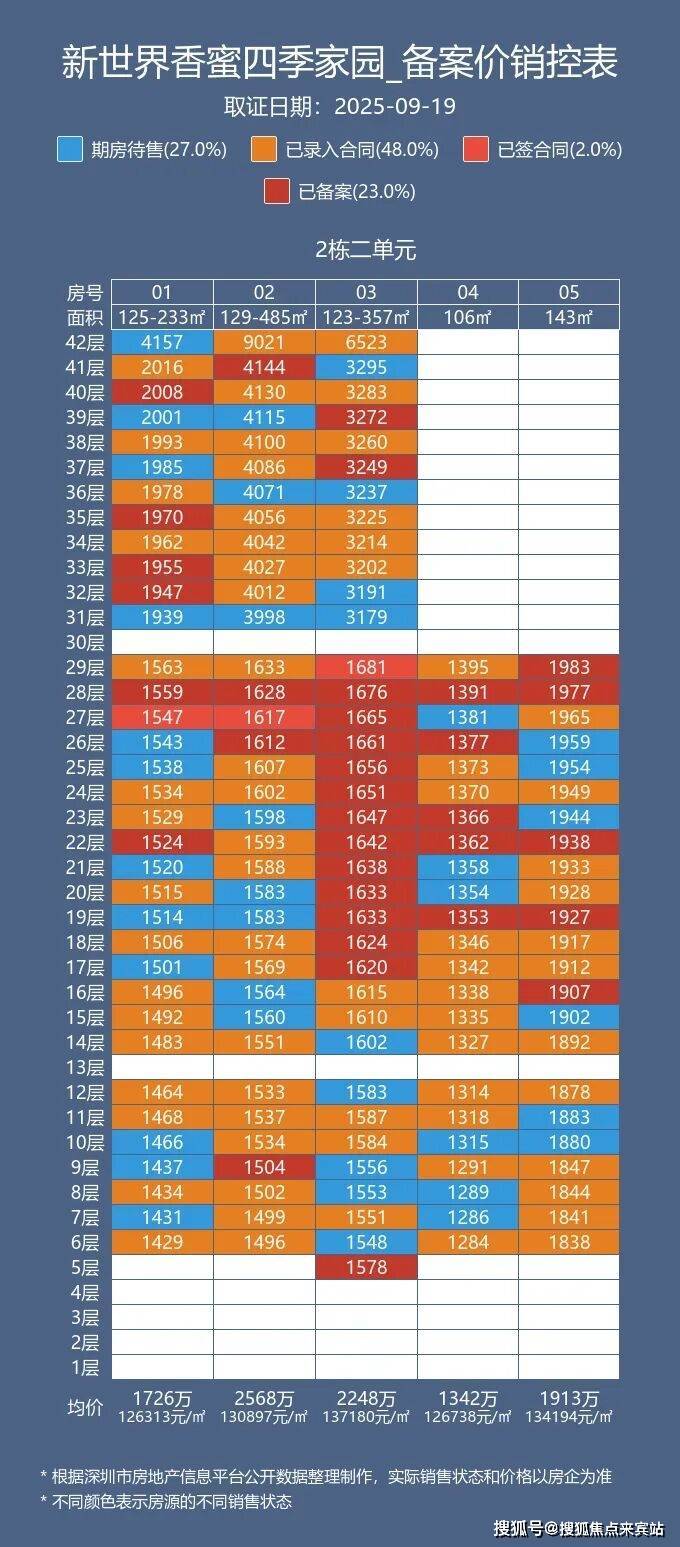 福田香蜜湖,新世界香蜜四季家园,去年9月19号已经取证!9月29日开盘!项目共923套房,面积有105-120-280㎡3-6房,还有2栋1单元的复式209-369㎡,2栋2单元243-491㎡,项目备案均价13万,开盘98+98+95折!目前开盘半年时间,152套房源去化了111套,还剩41套,以及后面700多套等待加推房源