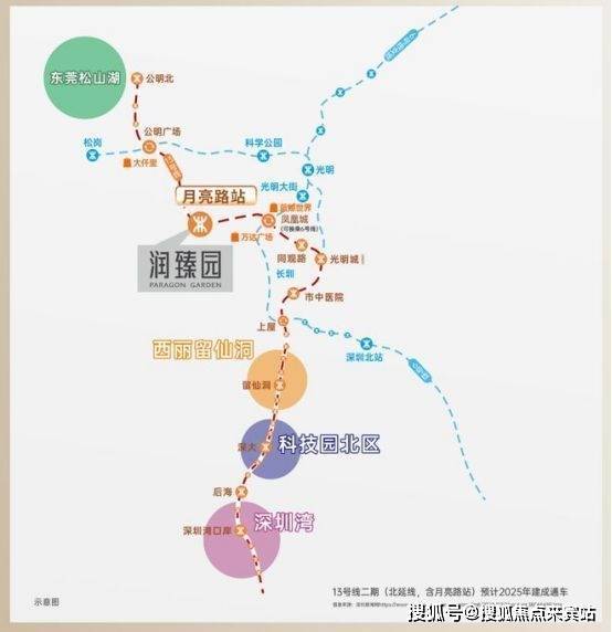 - 轨道交通:项目直线距离约300米可达地铁13号线月亮路站(建设中),2025年13号线二期(北延)有望建成通车。通车后1站可到凤凰城站,9站可到南山,未来还可串联东莞松山湖、深圳湾总部基地等科创走廊。此外,从月亮路站出发3站可到轨道枢纽光明城站,搭乘高铁可快速直达深圳北、福田。