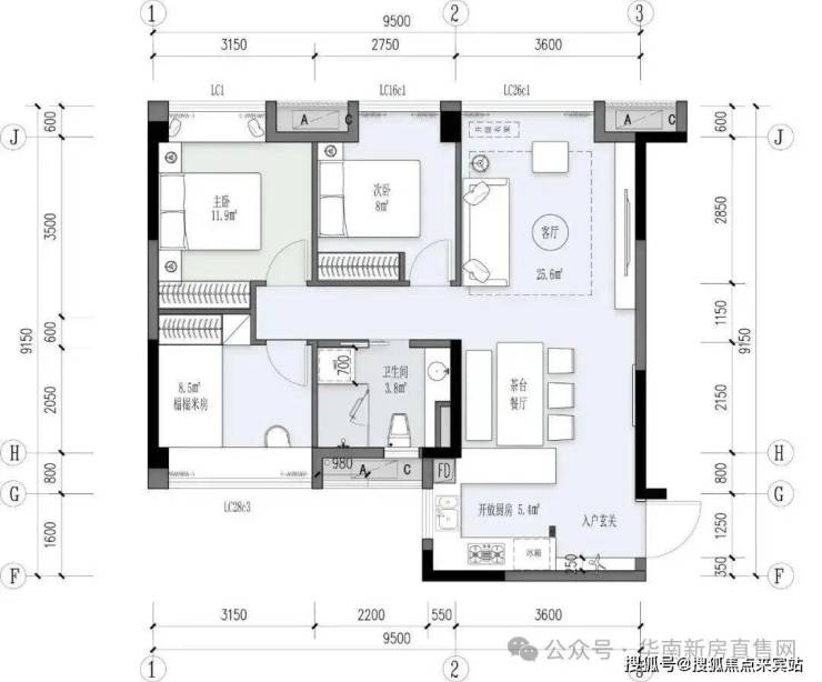 ②三房 D95A 面积约99㎡、阳台面积约11㎡