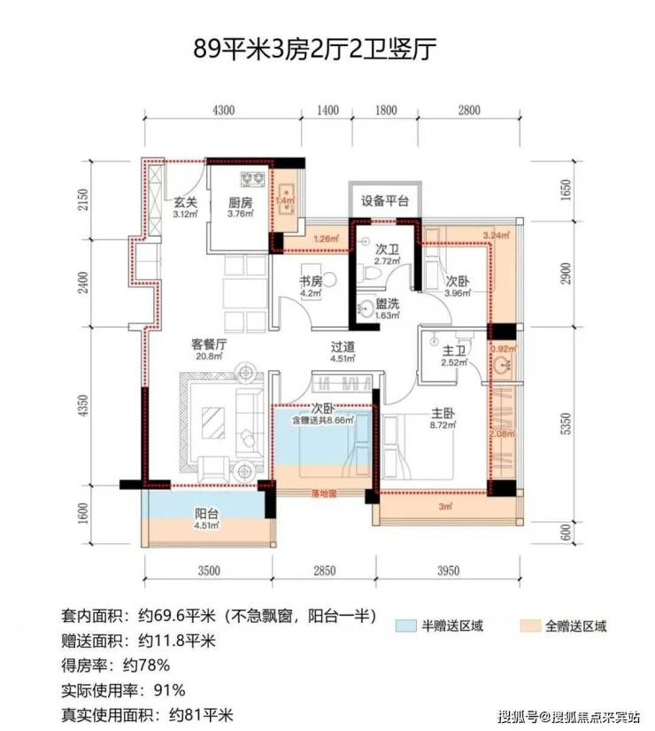 设计的是横厅南北通透格局,进门入户玄关,客餐厅6.35米开间,4个卧室分别做到了4米/3.5米/3米/2.7米的宽度,主卧+1个次卧270°飘窗,另有1个收纳间,客厅连接次卧出6.3米长大阳台,L型厨房,得房率约98.6%(包含赠送),阳台主朝西南或东南向。