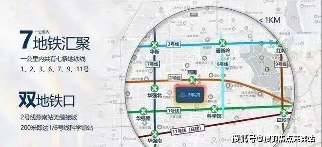 三地铁交汇地铁物业,0距离燕南地铁口(2号线燕南站),约400米到1号线/6号线科学馆站,片区800米内汇集1、2、3、6、7、9、11号七条地铁线,50多个地铁站口。