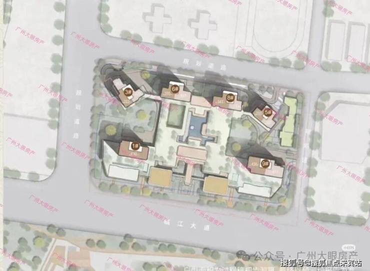 项目地势做了整体抬升,整体排布北高南低,呈半月型布局,共计6栋住宅。前低后高,前排2栋分别为35层和37层,后排4栋从东往西分别是50层、49层、49层和50层,前高后低的设计,以及后排两栋楼的扭转,也实现了100%望江,货量共约500来套。