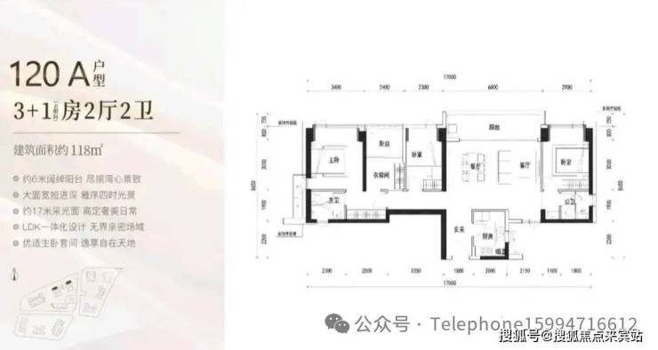 118㎡的4房2厅2卫,A户型(1栋1/2单元01户型),设计的是横厅格局,进门入户玄关,客餐厅6米开间,LDKB一体化设计,4个卧室分别做到了主卧17.65㎡/次卧11.02㎡/次卧9.12㎡/次卧8.74㎡(包含墙体飘窗),客餐厅出6米长的观景大阳台看深大校区,U型厨房,公卫三段式分离,得房率约90%(包含赠送),西北朝向。