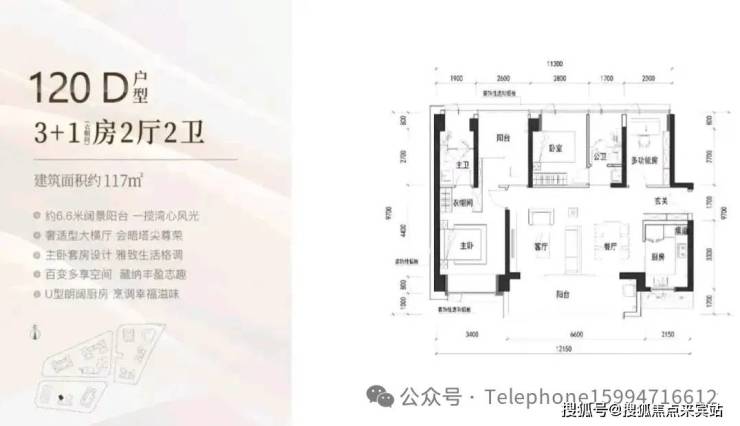 117㎡的4房2厅2卫,D户型(3栋2单元06户型),设计的是横厅南北通透格局,客餐厅6.6米开间,四开间朝南,4个卧室分别做到了主卧17.35㎡/次卧9.8㎡/次卧9.1㎡/次卧8.05㎡(包含墙体飘窗),客餐厅出6.6米长的宽景大阳台,U型厨房,公卫三段式分离,得房率约90%(包含赠送),西南朝向。