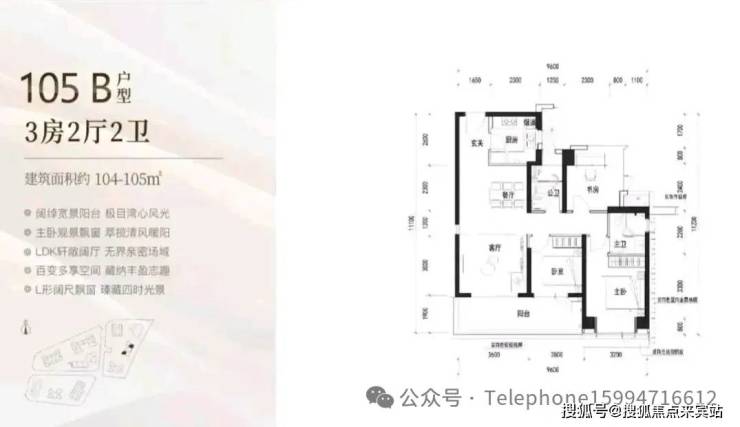 105㎡的3房2厅2卫,B户型(2栋3单元02/06户型),设计的是经典竖厅格局,客厅3.6米开间,LDKB一体化设计,三开间朝南,动静分区,3个卧室分别做到了主卧13.12㎡/次卧9.9㎡/次卧8.4㎡(包含墙体飘窗),客厅连接次卧出6.4米长的宽景大阳台,U型厨房,卫生间干湿分离,得房率约90%(包含赠送),正南或东南朝向。