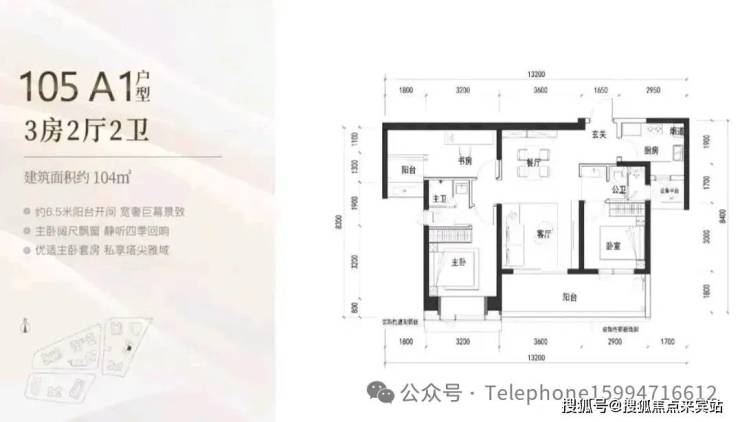104㎡的3房2厅2卫,A1户型(2栋3单元03户型),设计的是竖厅类双龙抱珠格局,客厅3.6米开间,客餐厅一体化设计,3个卧室分别做到了主卧12.8㎡/次卧12㎡/次卧8.7㎡(包含墙体飘窗),客厅连接次卧出6.5米长的宽景大阳台,U型厨房,公卫三段式分离,得房率约90%(包含赠送),东南朝向。