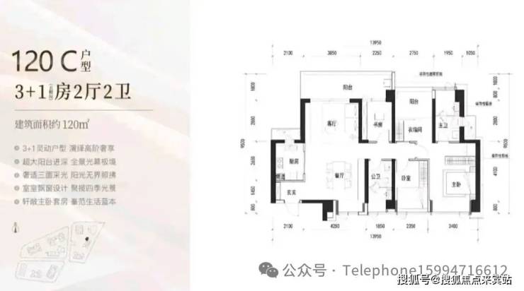 120㎡的4房2厅2卫,C户型(2栋3单元01户型),设计的是竖厅格局,客厅3.85米开间,LDKB一体化设计,动静分区,4个卧室分别做到了主卧16.65㎡/次卧9.9㎡/次卧9.16㎡/次卧6.3㎡(包含墙体飘窗),客厅连接次卧出6.1米长的宽景大阳台,U型厨房,卫生间干湿分离,得房率约90%(包含赠送),西北朝向。