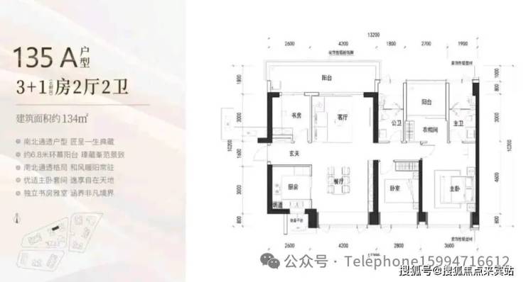 134㎡的4房2厅2卫,A户型(1栋1/2单元05户型),设计的是竖厅南北通透格局,进门入户玄关,客厅4.2米开间,LDKB一体化设计,四开间朝南,4个卧室分别做到了主卧19.44㎡/次卧10.64㎡/次卧10.26㎡/次卧7.8㎡(包含墙体飘窗),客厅连接次卧出6.8米长的观景大阳台看深大校区,U型厨房,卫生间干湿分离,得房率约90%(包含赠送),西北朝向。