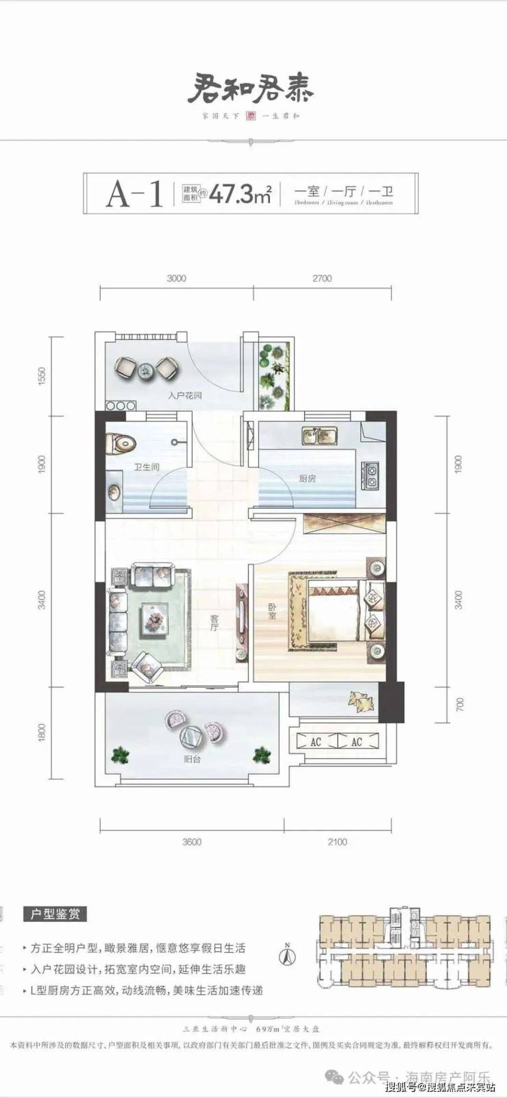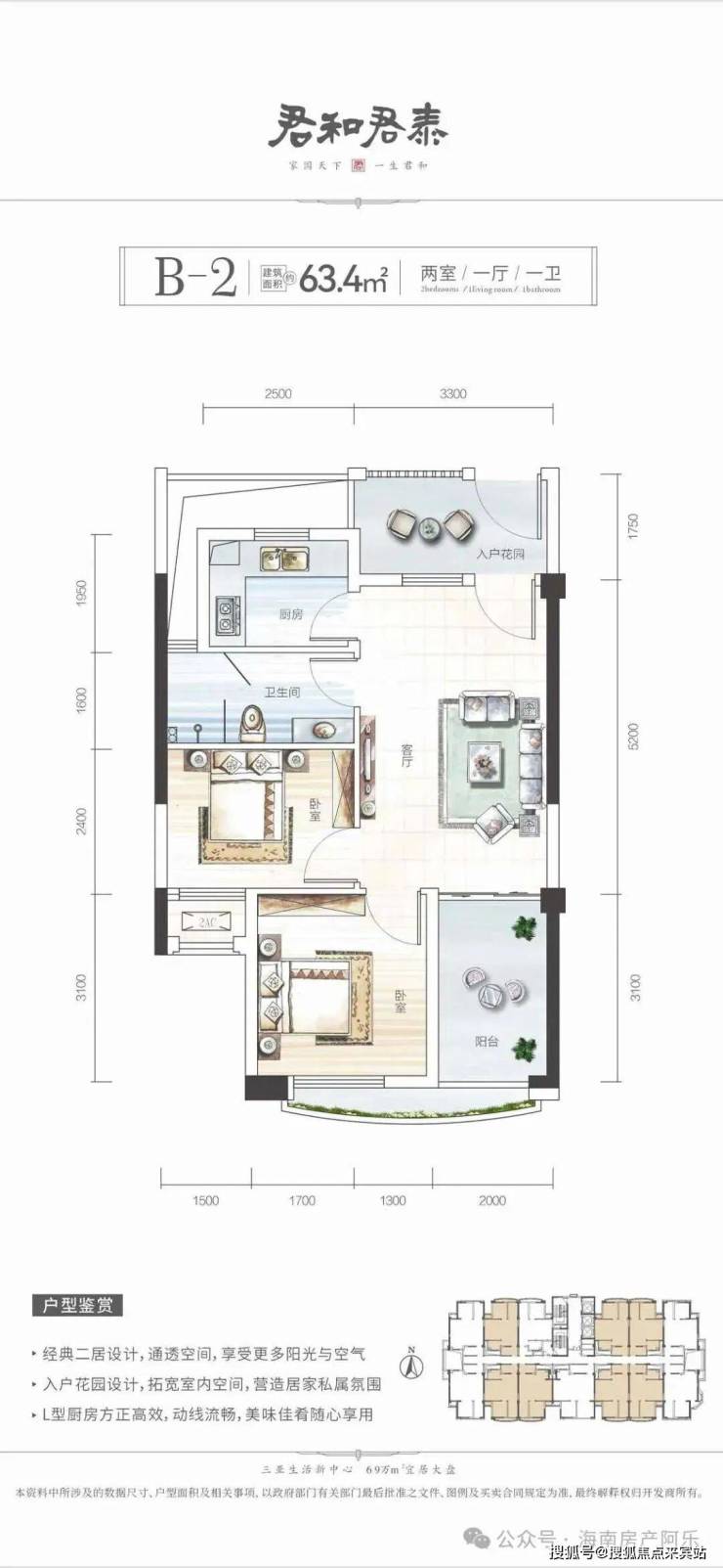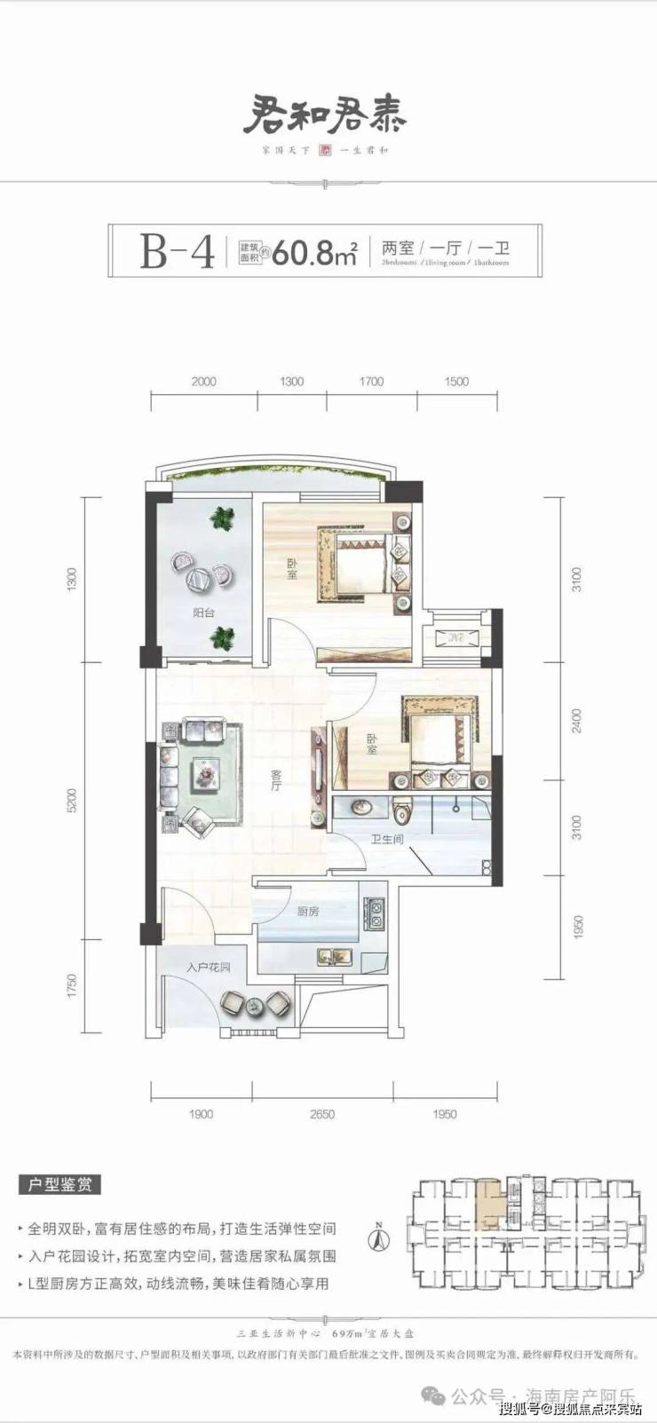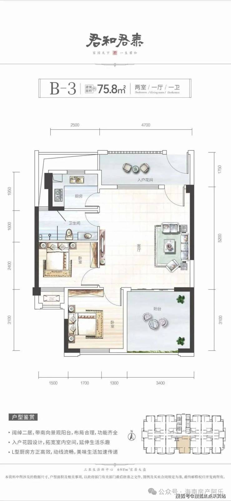产品主打47-126㎡多户型,110万起适配刚需度假,现房在售、品牌硬装交付,户型方正通透,部分带景观阳台。教育配套完善,周边南新小学、荔枝沟中学环伺,自带幼儿园,全龄教育无忧。君和物业加持,配双泳池与休闲场馆,近享乐天城、海旅免税城,兼具高性价比、成熟配套与宜居属性,是三亚刚需旅居优选