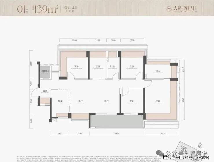 户型为113-114-115㎡四房和139㎡五房,标准层布局与保利瑧誉非常类似,但是没做独立电梯厅,2梯5户使用率高,凸窗做满再加上设备平台,所以赠送后得房率去到100%。