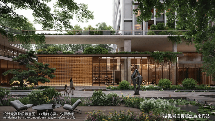 五栋塔楼采用错落布局,形成"双峰微翘"的起伏轮廓。