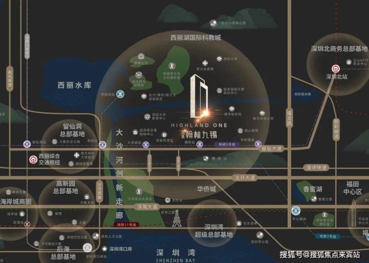 留仙大道正席,紧邻地铁5号线塘朗站,4/5/7号线3轨环绕,毗邻“三纵五横”主干道,瞬息通达全城。西丽高铁站(建设中)、深圳北站两大枢纽环绕,拥有世界交通能级。