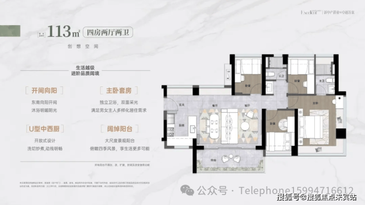 113㎡的4房2厅2卫,设计的是横厅南北通透格局,客餐厅5.65米开间,四开间朝南,全屋飘窗设计,4个卧室分别做到了3.2米/2.6米/2.45米/2.25米的宽度,主卧270度环幕视野,U型中西厨房,公卫三段式分离设计,得房率:76.54%(不含赠送),阳台主朝东南向。