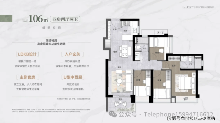 106㎡的4房2厅2卫,设计的是竖厅格局,客厅3.2米开间,LDKB一体化,S墙设计预留冰箱卡槽位,四开间朝南,4个卧室分别做到了3米/2.7米/2.25米/2.2米的宽度,U型厨房,公卫三段式分离设计,得房率:76.11%(不含赠送),有西南或东南朝向。