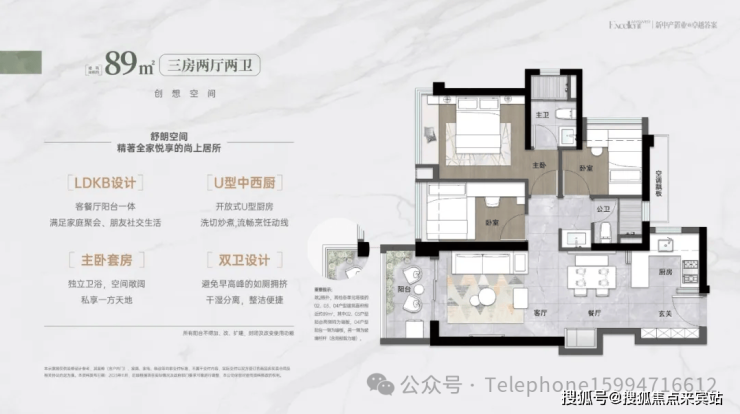 89㎡的3房2厅2卫,设计的是竖厅格局,客厅3.2米开间,LDKB一体化,S墙设计预留冰箱卡槽位,三开间朝南,3个卧室分别做到了3米/2.5米/2.3米的宽度,U型厨房,卫生间三段式分离,得房率:76.55%(不含赠送),有西南或东南朝向。