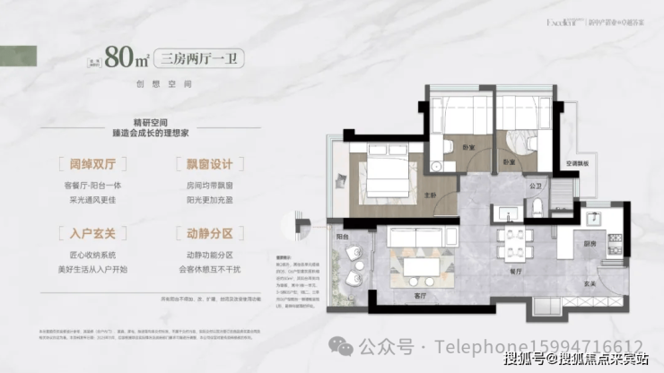 80㎡的3房2厅1卫,设计的是竖厅格局,客厅3.2米开间,LDKB一体化,S墙设计预留冰箱卡槽位,3个卧室分别做到了3米/2.4米/2.25米的宽度,U型厨房,卫生间三段式分离,得房率:76.54%(不含赠送),全部是西北朝向。