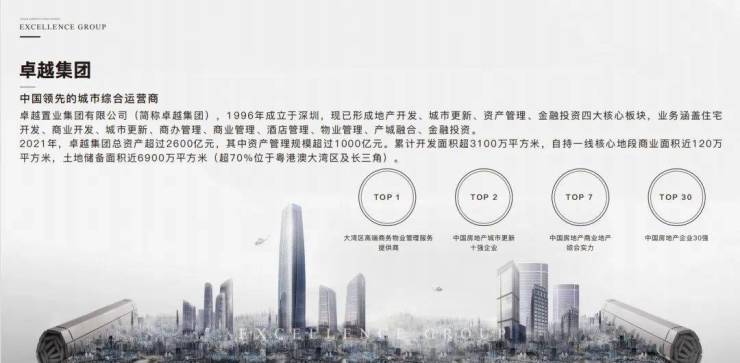 卓越集团自1996年成立以来,历经23年长足发展,已成长为立足深圳、布局中国,在行业内具有领先地位的大型商业及住宅综合性地产开发运营商。业务涉及房地产开发、商业经营、酒店管理、城市更新、物业管理、不动产担保等诸多领域。