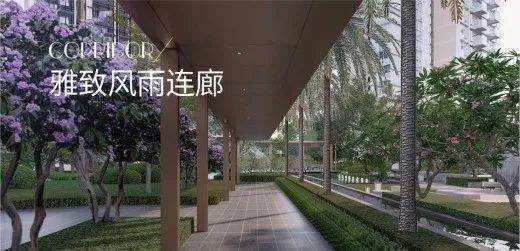 全链式风雨连廊,守护业主归家的每一步,半室内空间全天候尽享自然,晴雨从容。晴天,为居者遮挡骄阳烈日,细看闲庭花落;雨天,静观廊外,细雨纷纷,也别有一番美景。