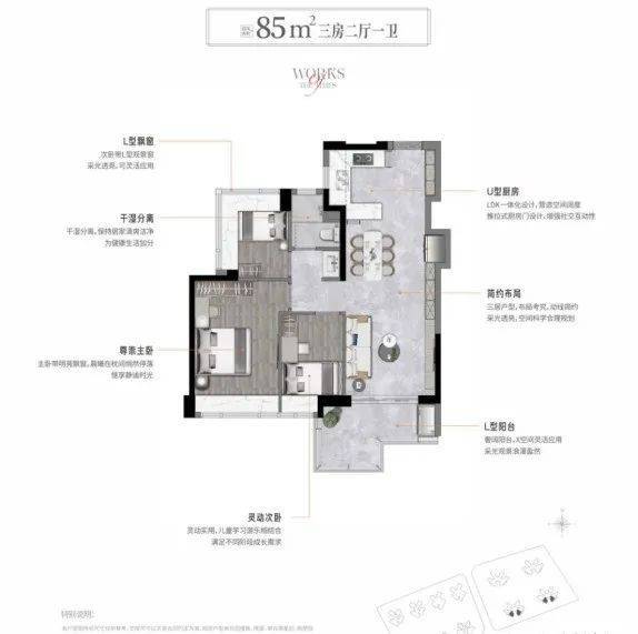 室内空间科学规划,布局合理,以LDK一体社交厅,套房式蜜月主卧,行政礼遇L型空中吧构成的超实用户型,满足星生代家庭三代的欢愉同堂及个人独处所需。