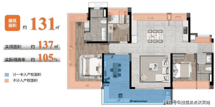 本次开放的高区约131㎡奢阔新品,得房率约105%,可使用面积跃升至约137㎡,堪称性价比之王。它不仅是空间尺度的优化升级,更承袭并升华了备受认可的品质基因。