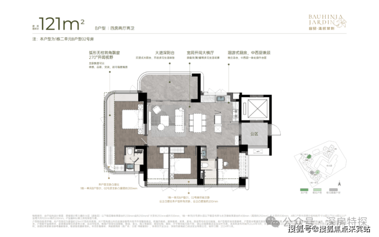 122㎡的4房2厅2卫,设计的是竖厅类双龙抱珠格局,专梯入户送5.7㎡的独立公区,客厅4.1米开间,LDKB一体化设计,五开间朝南,主卧大套间无柱弧形270°转角飘窗,4个卧室分别做到了主卧20.67㎡/次卧11.1㎡/次卧10.6㎡/次卧7.04㎡(包含墙体飘窗),客厅连接次卧出7米长的观景大阳台,U型厨房,卫生间干湿分离,得房率约76.7%(不含赠送),东南朝向。赠送面积20.93㎡(不含公区)),加上赠送后得房率94.09%。
