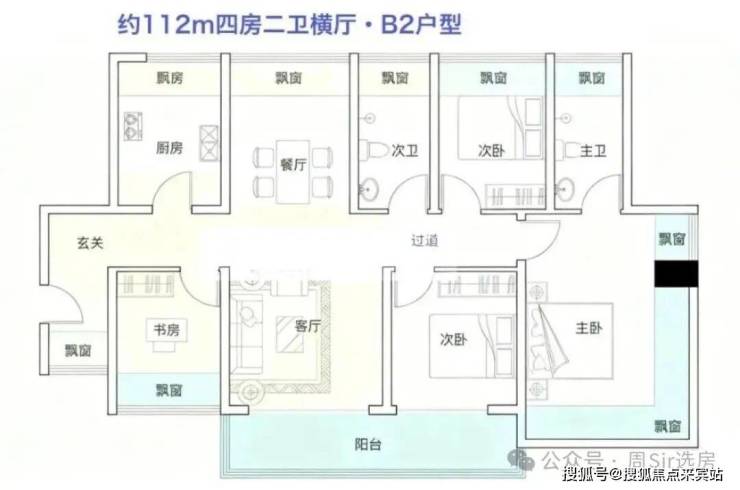 112㎡的4房2厅2卫(B1户型),设计的是横厅南北通透格局,进门入户玄关,餐客厅一体化设计,五开间朝南,全屋十面飘窗,主卧270°无柱转角飘窗,U型厨房,卫生间干湿分离,得房率约100%(包含赠送),客厅连接餐厅出大阳台西南朝向。