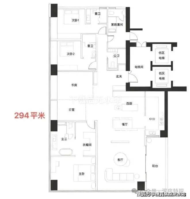 · 269-294㎡户型: 通常是四房以上大户型,注重家庭互动空间与个人私密空间的结合。