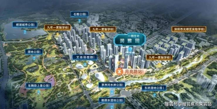 楼盘位于光明凤凰街道塘尾社区,紧邻茅洲河,片区更新单位有轨道13号线黄金科创线穿过,月亮路站上盖,建成后9站直达南山,而且项目地库将会直接连到地铁站。