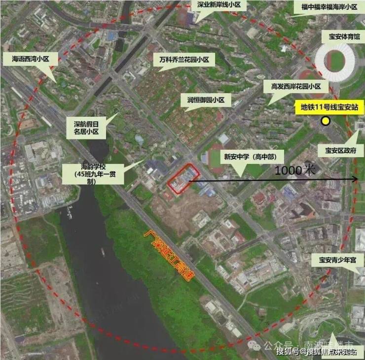 该地块位于宝中西侧,是宝中最后一个发展板块,具体位置在金科路与罗田路交汇处西南侧,北面是海韵学校、深航福利房深航假日名居,西面就是大铲湾,南面是湾区产业投资大厦,东面为新安中学(集团)高中部。