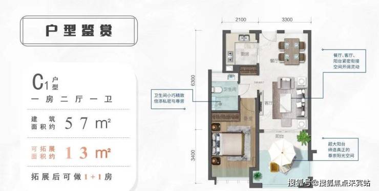 〖C1户型〗建筑面积:约57㎡拓展面积:约13㎡户型格局:一室二厅一卫(可改1+1房)
