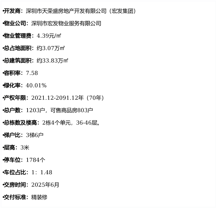项目位于光明区公明片区,原为宏发达叁城市更新,占地约3万㎡,总建面约30万㎡,规划建设2栋高达46层的150米、2栋36层的120米的商住楼,以及一所配套小学。其中A635-0259地块,总占地面积约2.24万㎡,总建筑面积约24.94万㎡,计容建筑面积约18.23万㎡,容积率7.58,绿化率40.01%,共由2栋4个单元住宅组成,其中3栋1/2单元住宅36F,3栋4/5单元住宅46F,3栋3单元写字楼38F,4栋是1所9班制幼儿园,
