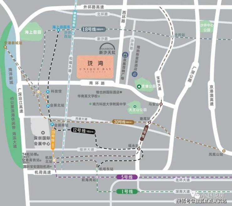 · 陆:周边有“一横三纵+三大高速”的交通路网,从项目出发经南环路接沿江高速约15分钟到前海,约20分钟到南山。另有宝安大道、107国道、京港澳高速,外环高速多条线路,约7分钟直达国际会展城及海洋新城