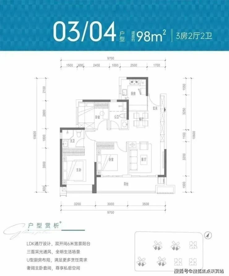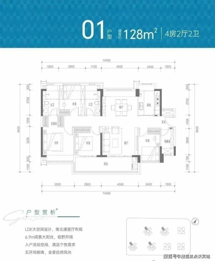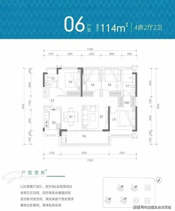 114㎡的4房2厅2卫,设计的是横厅南北通透格局,进门入户玄关,客餐厅6米开间,LDKB一体化设计,动静分区,四开间朝南,4个卧室分别做到了3.4米/3米/2.6米/2.4米的宽度,6米长的大阳台,U型厨房,公卫三段式分离,得房率:77.62%(不含赠送),阳台主朝东南向。