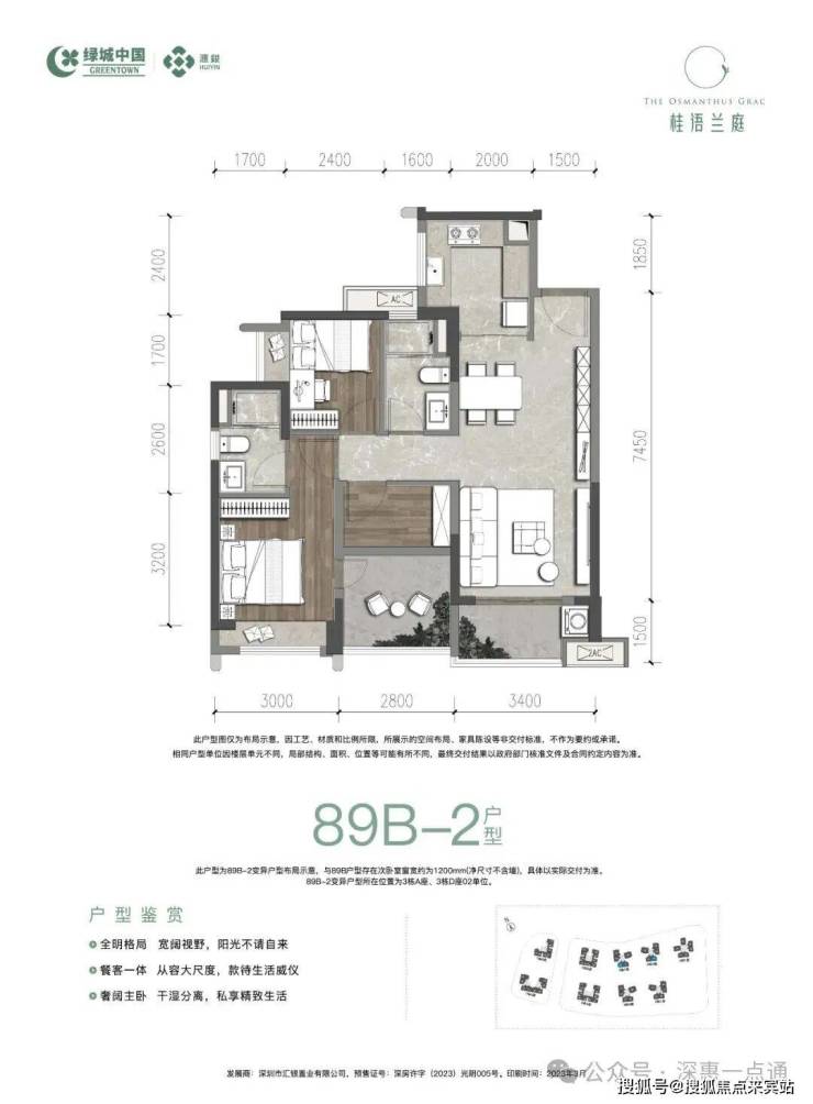 89㎡的3房2厅2卫(一期A-2户型),3栋B/C座01.02户型,设计的是经典竖厅格局,客厅3.4米开间,LDKB一体化设计,三开间朝南,动静分区,分别做到了主卧12.7㎡/次卧10.92㎡/次卧7.5㎡(包含墙体飘窗),U型厨房,卫生间干湿分离,得房率:75.2%(不含赠送),客厅约5㎡西南朝向。套内面积66.85㎡+赠送面积8.54㎡=实用面积75.39㎡,加上赠送后得房率约84.78%。