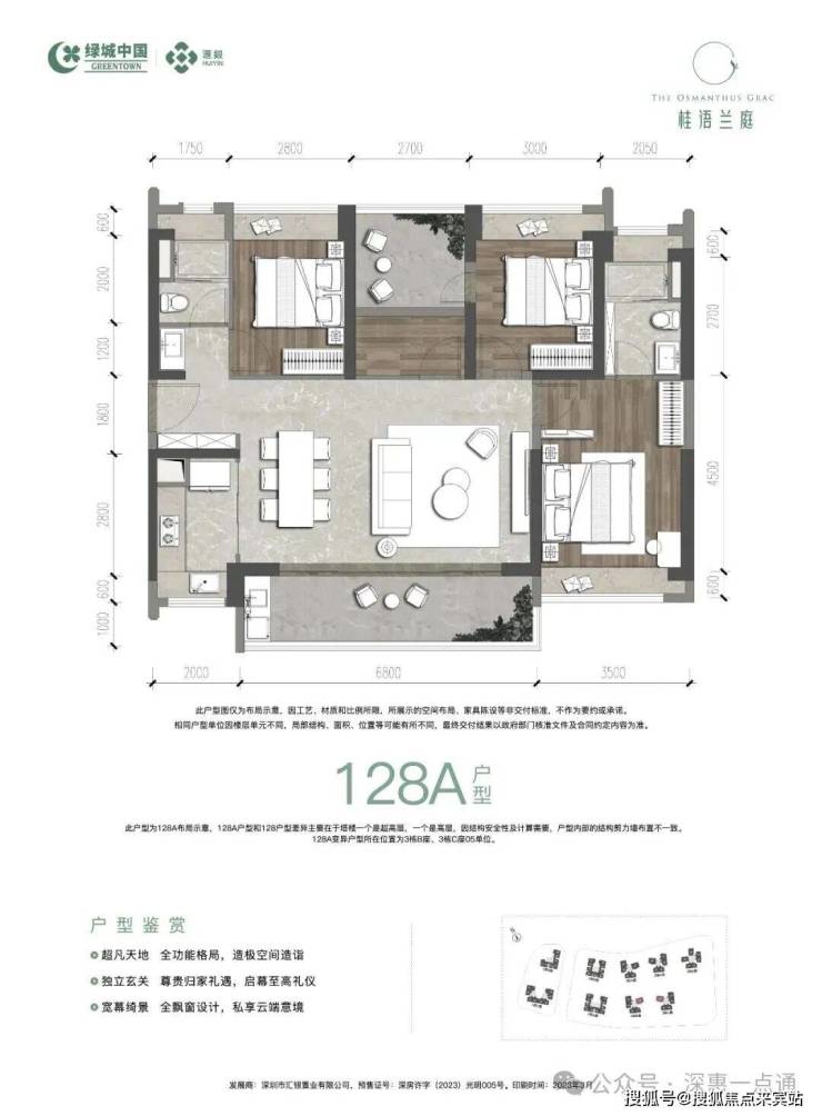 128㎡的4房2厅2卫(一期A户型),3栋B/C座05户型,设计的是横厅南北通透格局,客餐厅6.8米开间约30.6平,LDKB一体化,分别做到了主卧17.85㎡/次卧11.4㎡/次卧10.64㎡/次卧10.26㎡(包含墙体飘窗),U型厨房,公卫三段式分离设计,得房率:75.2%(不含赠送),阳台约11.56㎡西南朝向。套内面积97.5㎡+赠送面积16.61㎡=实用面积114.11㎡,加上赠送后得房率约87.99%。