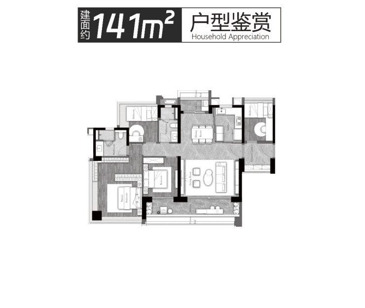 建面约𝟏𝟒𝟏m² 𝟑房+𝟐厅𝟐卫+灵动空间,全明多开间朝南,约𝟏𝟒.𝟔米IMAX采光视野,约𝟖.𝟐米景观大阳台,解放多重生活享受,主卧端厅设计,𝟐𝟕𝟎°全景采光,尽揽滨水美景