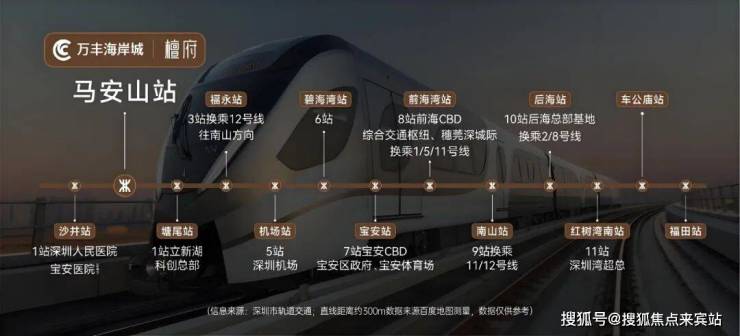 【交通高能——1地铁】极速动脉:项目距离地铁11号线马安山站直线距离约300米,享有深圳“最快线”的便利。更重要的是,距离地铁11号线8站即可直达前海综合交通枢纽,快速近距离享有前海国际金融、贸易、航运中心的发展红利。