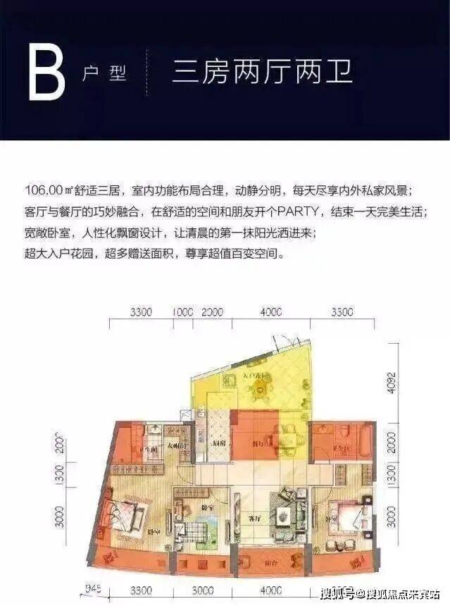 106.00㎡宽敞三居,室内功能区分明确,动静分明,每天独享内外私家风景。客厅与餐厅融汇相通,在舒适的空间内开个PARTY,尽显主人心境;宽奢卧室,人性化飘窗设计,让清晨的第一抹阳光洒进来;超大入户花园,超多赠送面积,尊享超值百变空间。